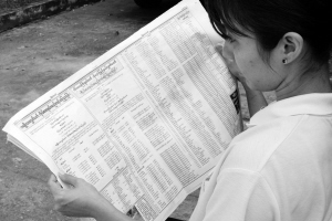 11月11日,缅甸仰光一名女青年正在阅读当天官方报纸上刊登的大选结果公告。据缅甸大选委员会已公布的两次公告,现任总理吴登盛领导的联邦巩固与发展党(巩发党)处于遥遥领先地位。新华社发