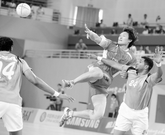 11月14日,中国队球员田剑侠(右二)在比赛中传球。当日,在第16届亚运会手球比赛男子预赛A组比赛中,中国队以23比23战平沙特队。 新华社记者 燕雁 摄