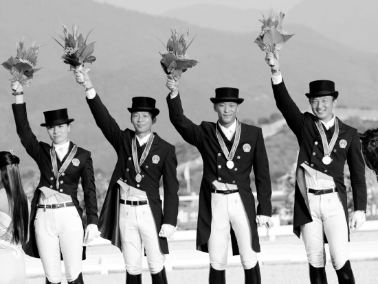 11月14日,中国队马术选手在颁奖仪式上。当日,在第16届亚运会马术盛装舞步团体比赛中,中国队以65.593分获得亚军。 新华社记者 杨宗友 摄