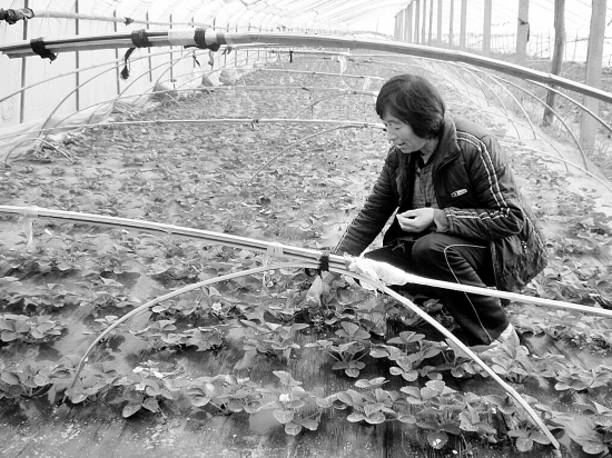近日,太康县运良特色优质水果专业合作社的社员正在整理大棚草莓。今年以来,该合作社积极引领农户种植草莓、油桃、西瓜等特色农业,使入社社员走上了致富路。 (记者 孙安平摄)