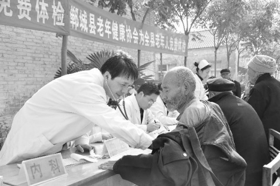 郸城县老干部健康协会成立以来,经常组织专家深入乡村为农民免费体检,送去健康和关爱。图为该县人民医院院长于健在为一位农民检查身体。(记者 卢好亮 通讯员 刘辉 孙小明 摄)