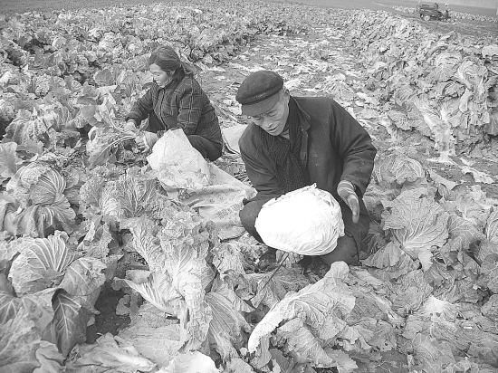 商水县引导农民因地制宜发展各类时令蔬菜,从而把“小蔬菜”做成了“大买卖”。图为该县平店乡施营村村民正在收获大白菜的情景。 (赵永昌 摄)