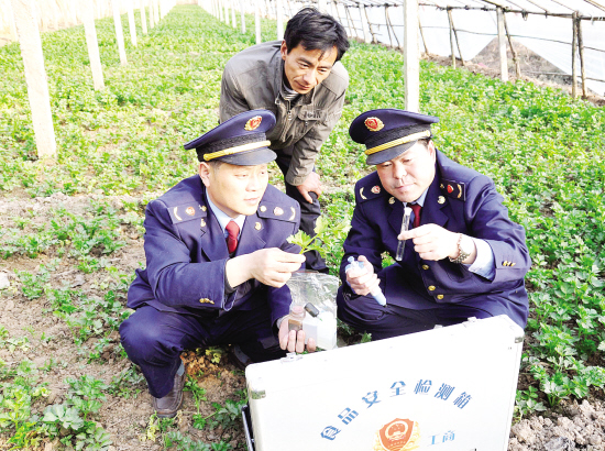 为确保群众消费安全,扶沟县工商局把食品安全监管扩大到田间,从生产源头防止剧毒、高残留农药的蔬菜流入市场,为群众吃上放心蔬菜起到了保驾护航的作用。图为该局执法人员正在蔬菜生产大棚内检测蔬菜。卢付昌 华伟 摄
