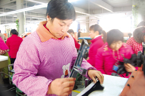 近年来,扶沟县坚持“工业立县”不动摇,积极创优软硬环境,以棉纺织造、机械制造、食品加工三大支柱产业为依托,以投资规模大、科技含量高为重点和主攻方向进行招商活动,促使一大批企业落户扶沟。图为该县产业集聚区内一企业的工人正在车间内紧张工作。