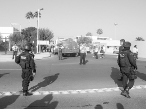 墨西哥一架军用运输机坠毁 11月24日,警察在墨西哥蒙特雷国际机场警戒。墨西哥一架军用运输机24日下午在墨北部城市蒙特雷国际机场起飞时坠毁,造成至少5人死亡。墨西哥国家民防部门表示,事故发生于当地时间下午2时25分(北京时间25日早4时25分),失事飞机为安东诺夫运输机,隶属于墨西哥空军。新华社发