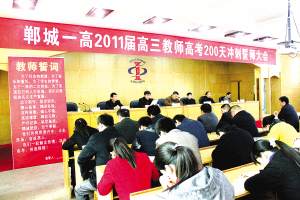 11月23日,郸城一高召开2011届高三教师高考200天冲刺誓师大会,全体高三教师纷纷定目标、表决心、发誓言,进入了高考备考冲刺工作状态。(王雪涛 摄)