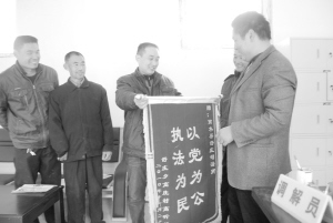 11月23日,商水县舒庄乡高庄行政村村民高听献、高连清、高书连将一面锦旗送到舒庄乡司法所,感谢为他们解决了纠缠3年的宅基纠纷。舒庄司法所发挥工作特长,真心帮助群众调解矛盾纠纷,赢得了群众的信任和称赞。(魏红 摄)