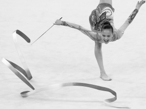 这是2010年11月26日,韩国选手孙延在第16届亚运会艺术体操个人全能决赛带操比赛中。