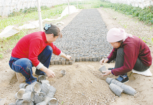 鹿邑县积极推进“一村一品”强村富民工程和专业示范村建设,打造了一批闻名全国、全省的“尾毛专业村”、“草编专业村”和“养牛专业村”,切实提高了村民收入。图为该县赵村乡无公害蔬菜村——小李庄行政村的菜农正在大棚内加工番茄营养钵。(胡海云 胡洪涛 摄)