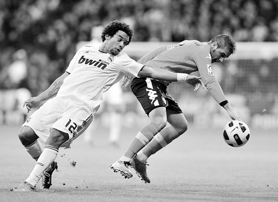 12月4日,皇家马德里队球员马塞洛(左)与对方球员争抢。当日,在2010/2011赛季西班牙足球甲级联赛第十四轮比赛中,皇家马德里队主场以2比0战胜巴伦西亚队。 新华社记者 陈海通 摄