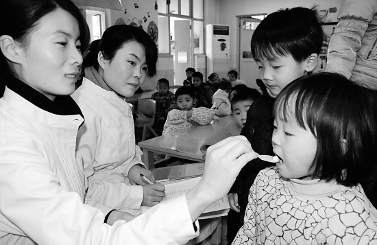 昨日,市疾控中心工作人员在为市直幼儿园的小朋友喂服“糖丸”。据了解,我市积极实行强化免疫,有效预防脊髓灰质炎的发生,确保了儿童的身心健康。 记者 李寒 摄