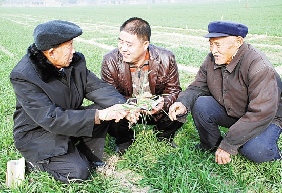 鹿邑县积极组织农业科技人员深入田间地头,调查今冬小麦生长情况,及时向农民提出小麦冬季管理意见。图为农业科技人员正在良种田里察看小麦分蘖情况。(胡海云 胡洪涛 摄)