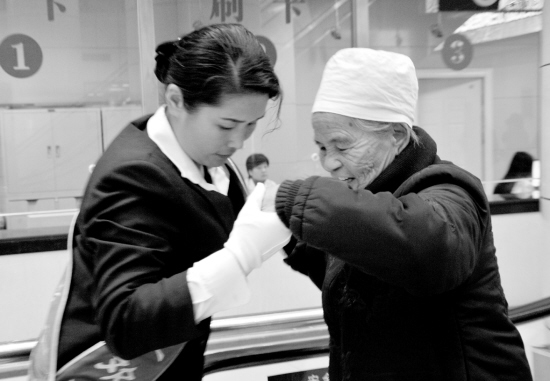 昨日,在市中医院宽敞明亮的大厅里,一位医护人员热情搀扶电梯上下来的老人。我市卫生系统内开展争创“廉医、诚信、为民”医院活动以来,各医疗部门认真落实各项规章制度,积极开展各项便民利民服务,方便了就医人员。 (记者 沈湛 摄)