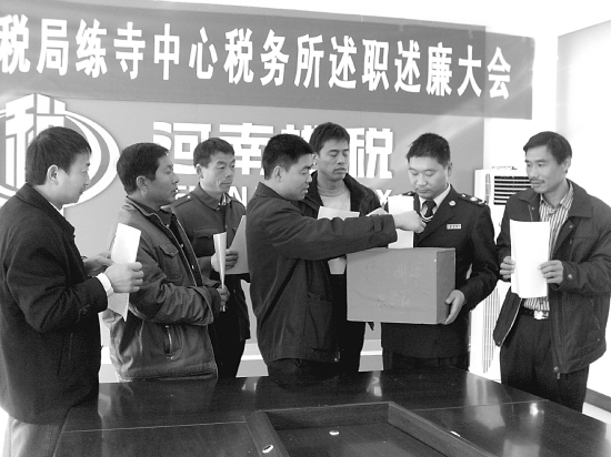 扶沟县地税局练寺地税分局开展为纳税人优质服务活动,推出多项便民措施。图为纳税人对他们的工作进行民主测评。(陈奎 摄)