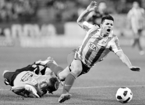 12月11日,马德里竞技队球员阿圭罗(右)在比赛中在对方守门员防守下失去平衡。当日,在2010-2011赛季西班牙足球甲级联赛第15轮的一场比赛中,马德里竞技队主场以2比0战胜拉科鲁尼亚队。