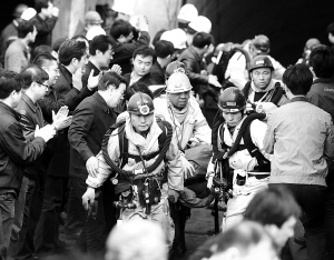 2010年3月28日,华晋焦煤有限责任公司王家岭煤矿发生透水事故,造成30余人遇难,另有115名矿工获救。这是4月5日,救援人员将获救矿工抬出井口。 新华社记者 燕雁 摄