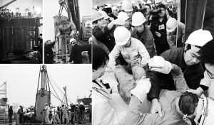 2010年11月18日,浙江嘉兴港区湖北籍工人范声家在水下钻孔钢护筒内作业时,护筒突然发生变形,他被困在水面以下18米深的护筒底部。事故发生后,嘉兴港区消防和平湖消防等部门先后赶到现场救援。左上:11月20日6时,工作人员在救援现场作业。右上:11月21日,参与救援的潜水人员准备下水。现场参与救援的潜水人员多达17人。中:11月21日,救援人员将钢筒吊起。下:11月21日,救援人员将范声家托出并放上担架。 新华社记者 黄宗治 摄