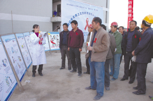 目前,艾滋病治疗仍是一个世界性的难题,世界上还没有一种有效的治疗方法。每年都有大量的患者死于艾滋病,很多人谈艾色变,不过只要我们在日常生活中稍加防范很容易避免感染该病。 图为周口市疾病预防控制中心组织宣传队深入建筑工地为工人讲解艾滋病防范知识。