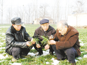 目前由于旱情严重,鹿邑县积极组织农业科技人员深入田间地头察看小麦生长情况,及时为农民提供治理小麦冬季管理办法,让农民及时浇水、施肥。图为农技专家在胡堂行政村察看小麦生长情况。