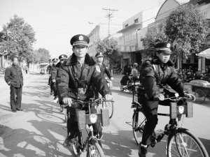 图为项城市孙店镇新组建20人的治安巡防大队亮相中心街区。这是孙店镇提升群众安全感,创建平安孙店的一大举措。(崔剑平 李俊 摄)