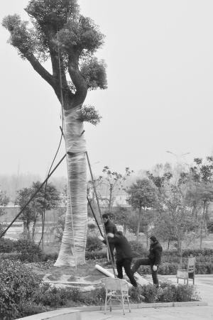 昨日,在东新区一家单位院内,几名工人正在给一棵名贵树木“穿”保温衣。随着气温下降,我市冬季绿化植物养护工作全面进入倒计时。据了解,今年冬季绿化植物养护着重进行防寒、抗旱保墒、除虫和修剪等工作,以确保植物度过一个温暖的冬季。