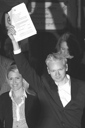 12月16日,“维基揭秘”网站创始人朱利安·阿桑奇在英国伦敦高等法院外手举法律文件庆祝。英国伦敦高等法院16日裁决维持伦敦威斯敏斯特区治安法庭的原判,批准“维基揭秘”网站创始人朱利安·阿桑奇保释。现年39岁的阿桑奇是澳大利亚人,2006年12月创建“维基揭秘”网站。今年,这家网站先后公布了大量关于美军参与阿富汗战争和伊拉克战争的秘密文件,引起轰动。新华社发