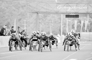 12月19日,参赛选手们在比赛中出发。当日,在广州2010年亚残运会男子马拉松T54级决赛中,日本选手洞上浩太以1小时27分42秒的成绩夺冠。