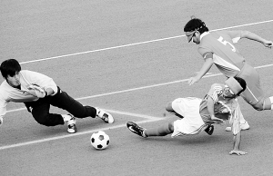 12月18日, 牛磊(左)在比赛中飞身扑救一名伊朗队员的倒地铲射。