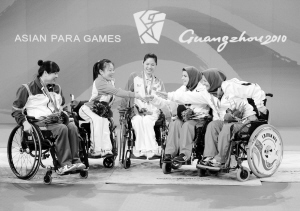 12月19日,获得冠军的中国队选手(中)、获得亚军的韩国队选手(左)和获得季军的伊朗队选手在颁奖结束后握手。当日,广州2010亚残会乒乓球比赛进入最后一天,共决出4个项目的冠军。在女子团体TT1-3级比赛中,中国队以3比0战胜韩国队,夺得冠军。 新华社记者 徐昱摄