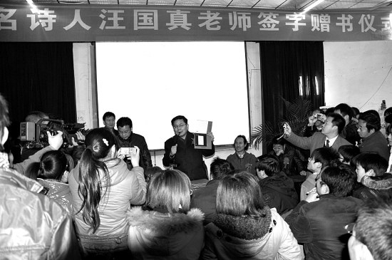 12月24日,应沈丘县醒民高中邀请,《书画名家报》专家组成员到该校进行援教活动,目的是为援建该校的微机室揭牌。随后,著名诗人汪国真举行了报告会,教育局和该校全体教师和学生2000多人聆听了报告。会后,汪国真(中)、马奔、米耕为与会人员签名赠书、增画。 (韦伟 张煜贞 摄)