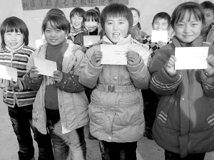 12月27日,商水县舒庄乡杜店学校的几名留守儿童把新年祝福写在贺年卡上准备寄给远在外地打工的爸爸妈妈们,以表达她们的思念和新年祝愿之情。(乔连军 摄)