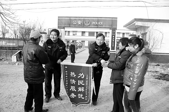 12月25日,湖南籍女大学生娜娜(化名)的父母专门制作了锦旗,送到西华县公安局清河驿派出所民警刘湘江(左二)手里以表谢意。去年12月,娜娜与父母发生口角后离家出走。一年来,其父母辗转广东、湖南等地寻找。刘湘江了解情况后倾力帮助,经过一个多星期的摸排,终于在娜娜的朋友家找到了娜娜。娜娜母女在分别一年后团圆。任君箫 摄