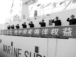 两艘千吨级巡航执法船入编中国海监 1月6日,海监工作人员在“中国海监23”巡航执法海监船上参加入列仪式。当日,1500吨级“中国海监15”和1000吨级“中国海监23”巡航执法海监船在青岛正式入编中国海监北海总队海监船舶序列。这两艘海监船的主要任务是在我国管辖海域开展巡航监视,对侵犯国家海洋权益、违法使用海域、损害海洋环境与资源、破坏海洋公共设施、扰乱海上秩序等违法行为作出快速反应和依法查处,并对海洋污染事件进行应急监视。新华社记者 张旭东 摄