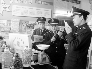 近日,太康县工商局举行了食品安全突发事件应急处置实战演练活动。图为执法人员在一食品店内检测食品质量,并随时向指挥中心汇报查处情况。(王青俊 令华 摄)