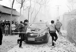 昨日,鹿邑农村一青年结婚时,亲戚朋友在进行社火跑动。春节临近,许多打工返家的适龄青年步入结婚行列。虽然过去接新娘的花轿已被小汽车代替,但一些传统婚俗至今还在沿用。