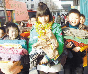 近日,商水县采取一所城里小学帮助一所农村小学的结对帮扶方式,动员城内的小学生在家庭条件允许的情况下,自愿给乡村的孩子捐赠棉衣,让他们在寒冷的冬季感受到温暖和关爱。图为商水县直二小的同学们正在积极捐赠的场景。(戚富岗 摄)