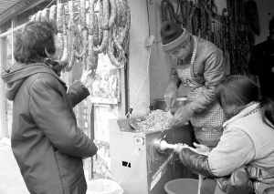昨日,一位市民在香肠灌装点加工香肠。临近春节,灌香肠、腌腊肉是许多家庭的“必修课”,许多灌装点生意十分火爆。记者 王映 摄