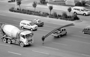 昨日,一辆小型客货两用车违规超长载物横穿周口大道,如此运输方式带来极大的交通安全隐患。有市民表示,周口大道贯穿市区南北,车流量较大,希望来往司机遵守交通法规,安全行车。记者 沈湛 摄