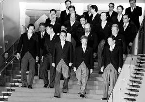 1月14日,在日本首都东京首相官邸,新内阁成员从台阶走下,准备合影。当日,日本首相菅直人组建新一届内阁,前内阁中有11人留任、2人改任,新内阁中增加了枝野幸男等4名新大臣。这是菅直人去年6月就任首相以来第二次改组内阁。新华社发