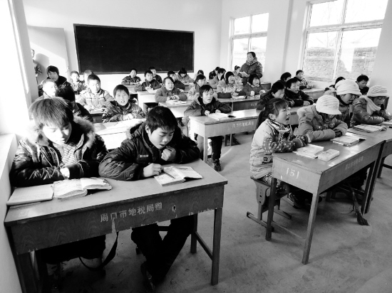 1月12日,在李埠口乡郭河小学校园内,学生们正在刚刚建好的教室里听课,而暑假前这里还是一片危房。近年来,川汇区对教育危房改造工作高度重视,“十一五”期间共改造19所中小学,新建面积19669平方米,总投资达到1348.24万元。樊葩菡 季百泉 李杰峰 摄