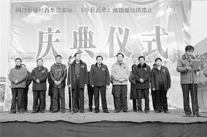 1月13日,周口日报社西华记者站和《今日西华》编辑部同时挂牌成立。省委宣传部新闻处领导白建宽、市委宣传部副部长李柏森、周口日报社总编辑叶楠、西华县委书记赵新安,分别为周口日报社西华记者站、《今日西华》编辑部揭牌。西华县四大班子领导耿宝山、范庆云、李宗喜、苏中林、尚卫东、杨群周、王建林、郭继红、刘从修、张翠霞,周口日报社副总编辑李建成及西华县各县直单位、乡(镇)、办事处党委主要负责同志参加了挂牌仪式。 记者 高洪驰 摄