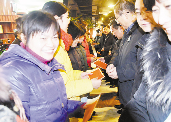1月20日,在市区五一广场,部分低保户高兴地领到了价格补贴品。春节即将来临,为确保市区低保户度过一个安乐祥和的春节,我市继续启用政府价格调节基金对中心城区城市低保户发放价格补贴品。记者 王映 摄