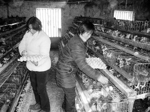 图为商水县平店乡吴吉屯村一个“股份制养鸡场”内两名留守妇女正在收获鸡蛋。近年来,平店乡党委、乡政府立足于培育新农民、发展新产业,积极鼓励广大留守妇女“股份合作、抱团创业”,有效地推动了农村经济发展和社会主义新农村建设。(赵永昌 摄)