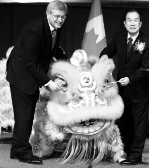 1月21日,加拿大总理哈珀(左)在多伦多举行的加拿大杰出华商颁奖暨春节庆祝晚宴上与中国驻加拿大大使章均赛一起为舞狮点睛。加拿大总理哈珀当晚出席在多伦多举行的第六届加拿大杰出华商颁奖暨春节庆祝晚宴并发表讲话,向加拿大华人致以农历新年的问候。