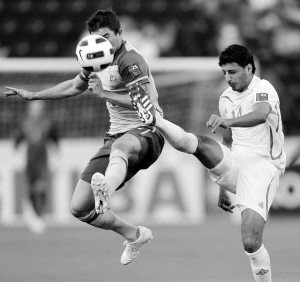 1月22日,伊拉克队球员萨拉姆(右)与澳大利亚队球员争抢。当日,在多哈举行的亚洲杯足球赛四分之一决赛中,澳大利亚队对阵伊拉克队。