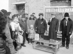 今年70岁的太康县退伍老兵马克明组织38位老战友,成立了一支“爱国主义教育报告团”, 走进该县中小学校、社区、乡村义务宣讲,从2009年至今已宣讲100多场,受教育人数达20多万人次,获得了良好的社会效果。图为1月24日,报告团成员在独塘乡西鲁村向村民讲解革命故事。王映 摄
