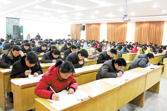 为增强教师学习意识,提高教师业务水平,打造学习型教师队伍,日前,郸城一高利用假期举行了学科知识大奖赛。图为各学科一线教师在答题时的情景。(王雪涛 摄)