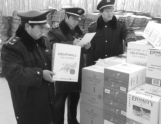 近日,扶沟县工商局根据群众举报联合县公安局在该县白潭镇某村查获一大型制造假葡萄酒窝点,查处各类假葡萄酒4种900余件、包装标识1.5万多套,涉案金额11多万元。目前,该案已移交公安机关作进一步调查处理。图为执法人员正在清点查获的葡萄酒及包装标识。(卢付昌 张丙纪 摄)