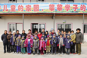 工行人员为淮阳安岭实验小学的16名孤儿送去书包等。