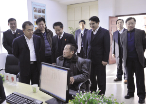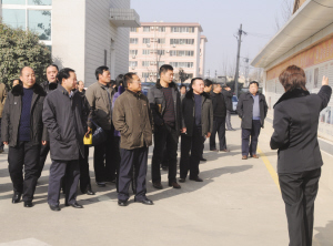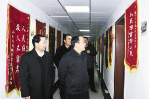省法院院长张立勇(前左一)在市委常委、政法委书记朱家臣,市法院院长张明山的陪同下,到市中级法院视察指导工作(摄影/徐林)